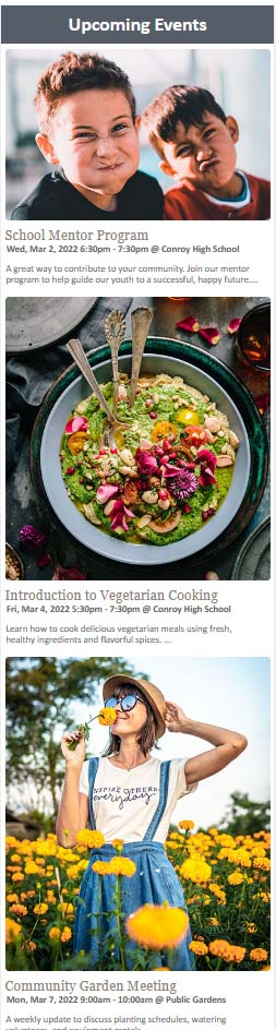 Our Upcoming Events List is a great way to promote your events on any web page. Update calendar events from any device and instantly update website's upcoming events list. For responsive websites, learn about our responsive upcoming events list option.