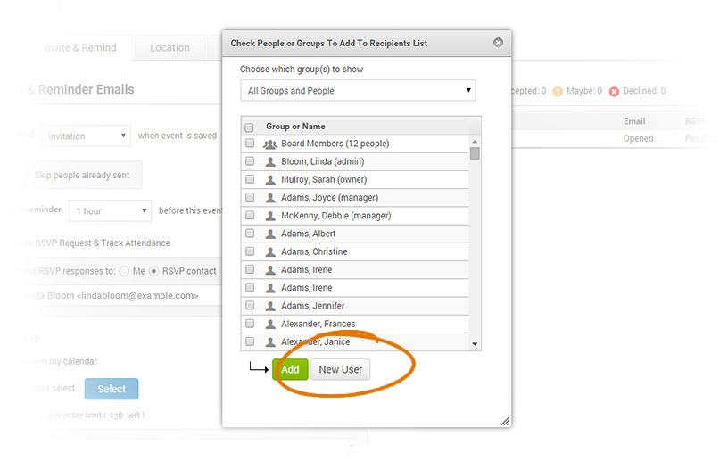 Select attendees and set reminders as you always have. It’s easier to add subscribers without going to the Admin Menu.